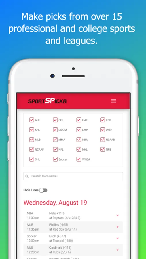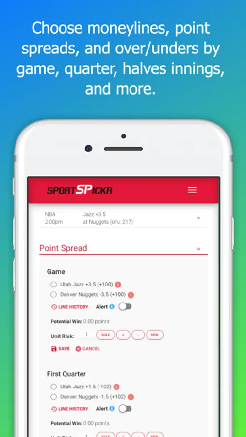 - Make picks on which team will cover from a variety of sports (NFL, NCAAF, NBA, MLB, + many more) and odds (money line, point spread, and over under). Vegas lines and point spreads are updated throughout the day so you will have latest odds.