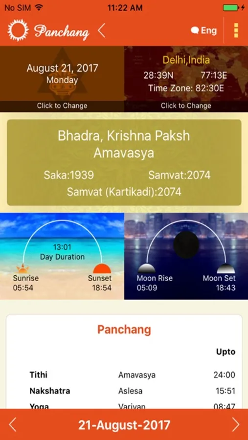 Panchang:- The Panchang refers to the five limbs of the hindu calendar: Tithi, Day, Nakshatra, Yoga and Karana. In this section the user gets Panchang for any day and any place with accuracy of second for 200 years i.e. from 1900 to 2100.