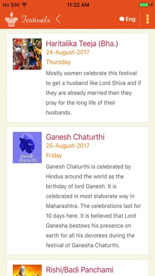 Festivals Information:- In festival section not only the accurate dates of festivals rather the significance, history and the method of celebration of each festival has also been described. In addition to that the upcoming festival sections gives the list of upcoming festivals so that the user of the app updates and prepares himself accordingly. Similarly in fast (Vrat) section the list of fasts with significance & method of observing fasts have been described.