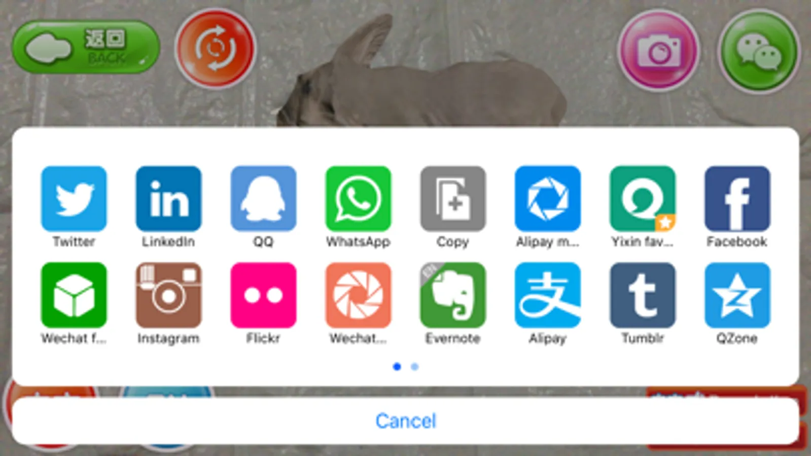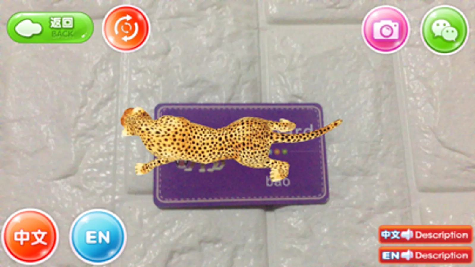 将摄像头对准印有图案的卡片,相应的模型通过渲染后就会生动的站立在卡片上方,用手触碰会有叫声和动作,卡片拿开后,物体会出现在屏幕中间,这时小朋友可以点击中英文按钮进行单词学习,也可以点击中英文描述按钮听取对应物体的简介,当然你还可以随意移动它并可以和他拍照,然后把它通过微信,QQ等与你的家人朋友分享。