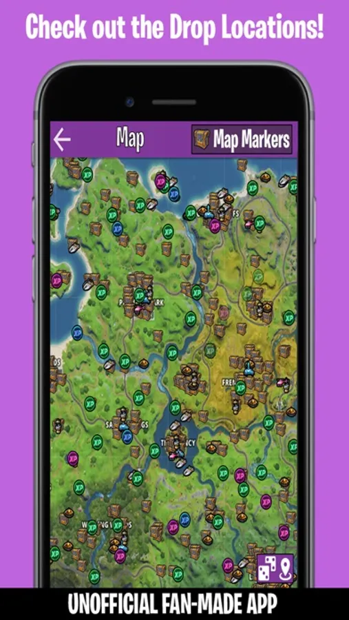 - Map for the Battle Royal mode, Map is Zoomable and Pannable. Important map markers such as Chests, XP coins and a lot more. An optional high density grid is also available to make it easier to coordinate positions.