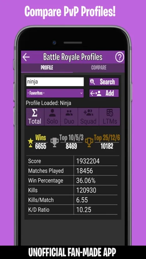 -Profile Search: View Battle Royale Player Stats grouped by squad type. Favorite Players for even quicker lookups.
