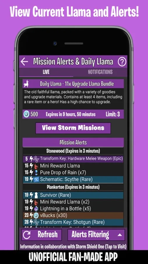 -- Mission Alerts with Rewards and Daily Llamas that can be refreshed any time