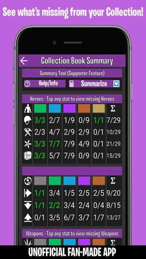 -- Collection Book: Keep track of the Heroes, Traps, People and Weapons that you own or have booked making it easier for you to choose Rewards. Includes a supporter features that can summarize your Book state and show only the missing items.