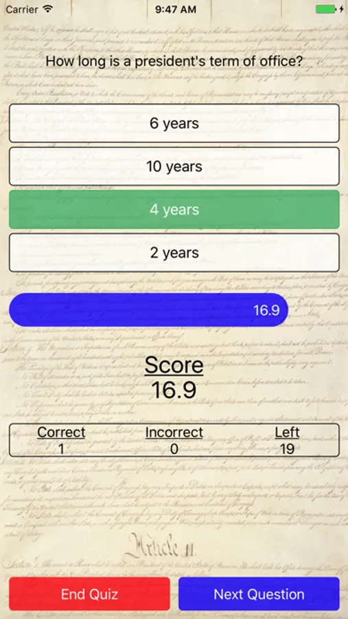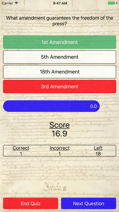 Become an expert on the United States Constitution in no time with Constitution Quizzer! Try quizzes in 3 levels of difficulty to eventually earn the rank of Founding Father and compete with your friends to make it to the top of the leaderboard!