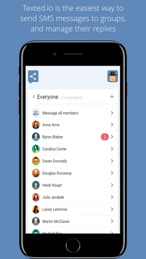 Texted is the easiest way to send bulk SMS messages to groups, and to respond to their replies individually. Unlike traditional group texting, your contacts will not see one another in the text thread, and only you will receive their replies for direct follow-up from the app. You can access your Texted account on the web as well, at texted.io.