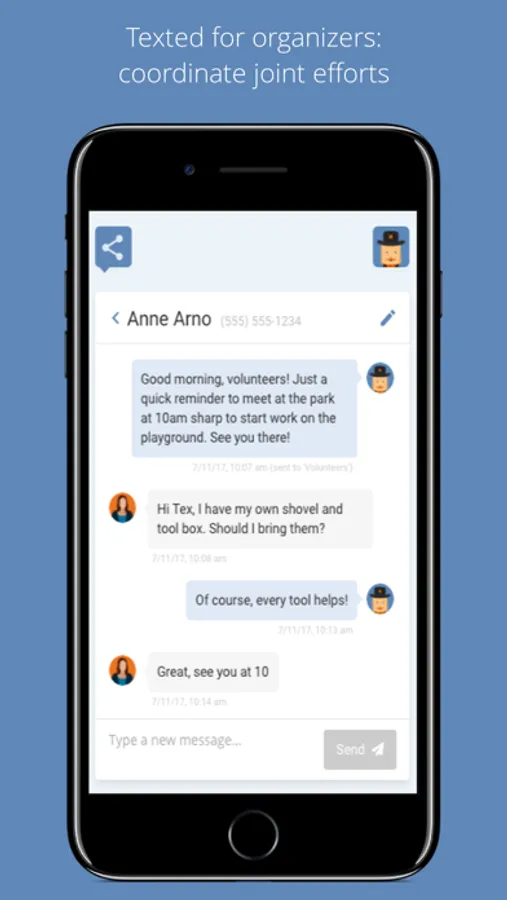 -Texted for organizers: Coordinate volunteers or project contributors to let them know when to meet where, and who is working on what.