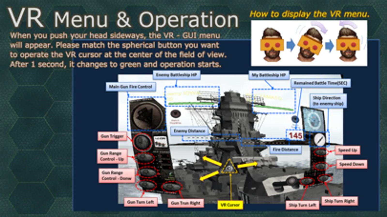 The VR battleship operation menu is basically the same as the free iOS application “BATTLE OF BATTLESHIP". Tutorial on battleship operation is also prepared for this application, so please refer as necessary.
