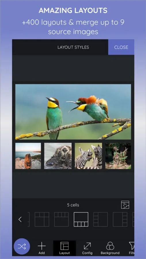 2. Layout Pic will choose a random layout. You can choose another or tap on random button to pick a random layout.