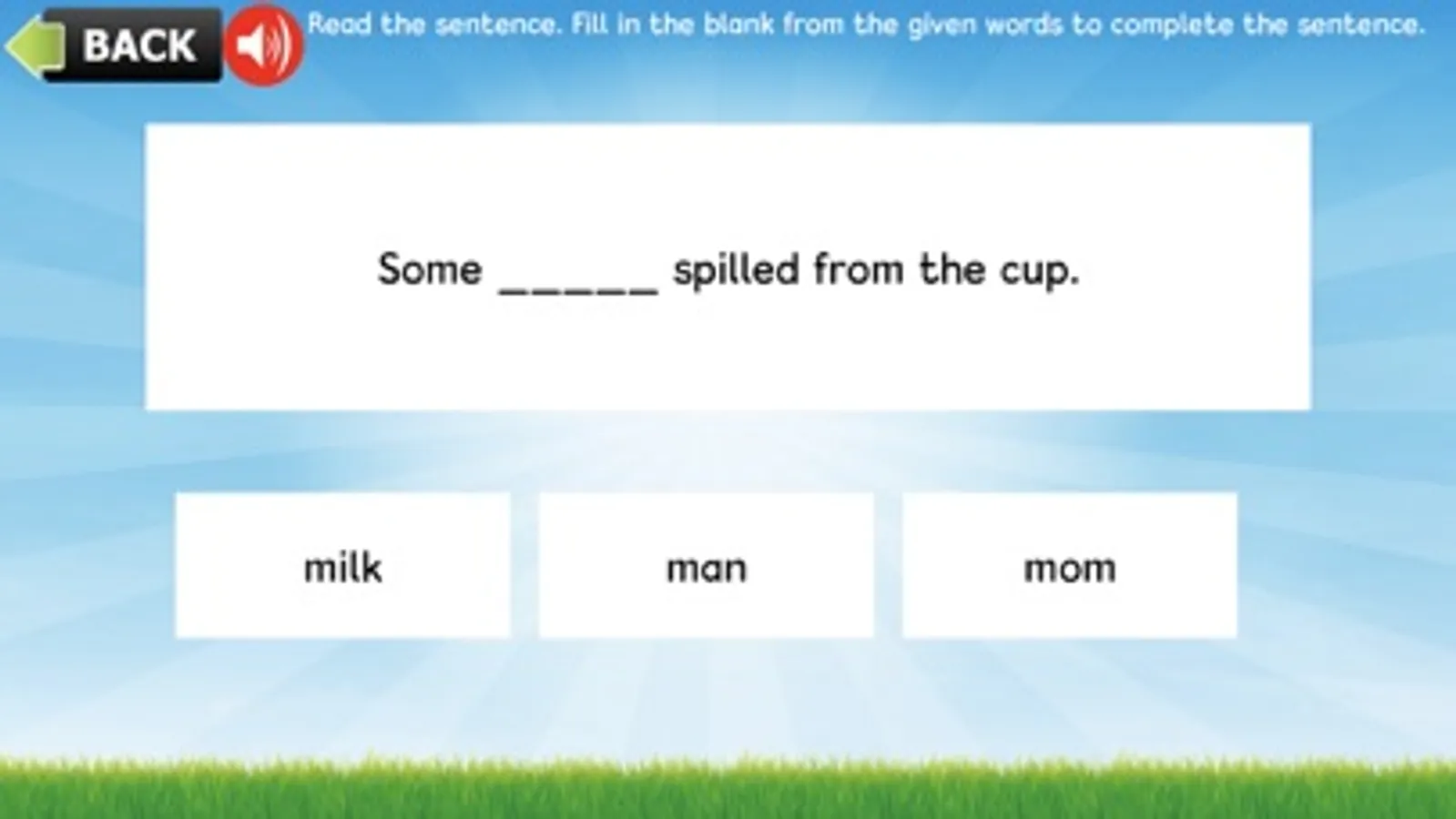 Here we give simple sentences to the child but with a blank. The target is to read them and find the best suitable word.