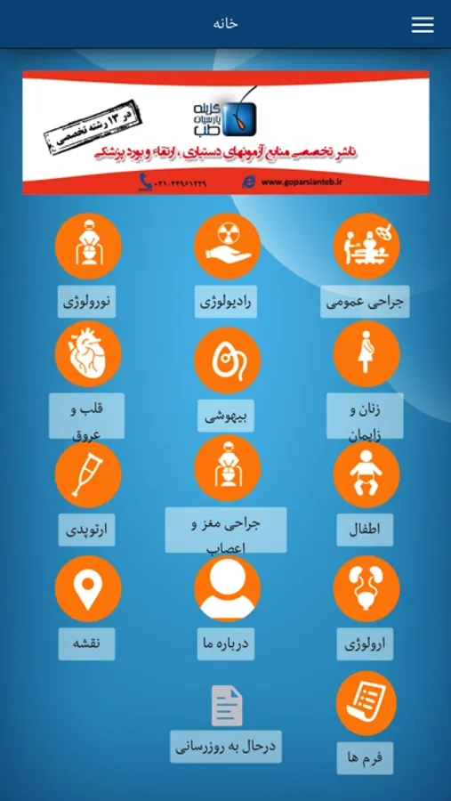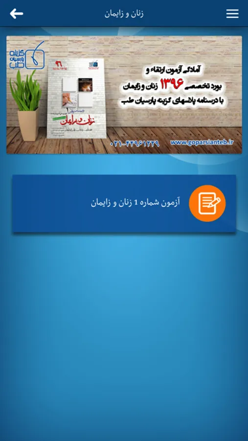 آزمون آنلاین پزشکی, گزینه پارسیان طب, آزمون آنلاین, ارتوپدی, قلب و عروق, زنان و زایمان, چشم پزشکی, نورولوژی, رادیولوژی, جراحی مغز و اعصاب, اطفال , جراحی عمومی , بیهوشی , ارولوژی , پاتولوژی انتشارات گزینه پارسیان طب ناشر تخصصی منابع آزمون های دستیاری، ارتقاء و بورد پزشکی خدمتی نوین از انتشارات گزینه پارسیان طب جهت رفاه حال داوطلبان آزمون های تخصصی پزشکی در رشته های : - ارتوپدی - قلب و عروق - زنان و زایمان - چشم پزشکی - نورولوژی - رادیولوژی - جراحی مغز و اعصاب - اطفال - جراحی عمومی - بیهوشی - ارولوژی - پاتولوژی شامل تست های تالیفی اساتید برتر و نکته های کلیدی جهت دوره ی سریع منابع آزمون
