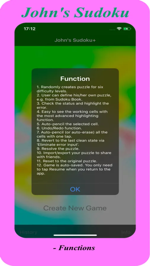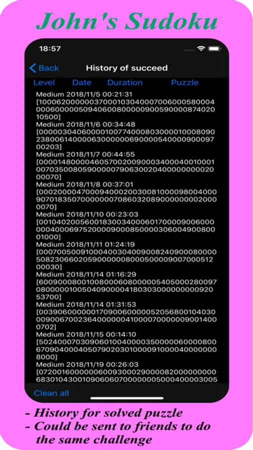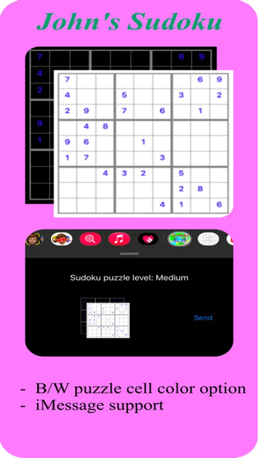 John's Sudoku is one of the most comprehensive Sudoku game systems. It randomly creates puzzles for six difficulty levels. You may never meet the same puzzle. But you can do the same one via user defined puzzle. Or you can define your own puzzle via Sudoku Book. You can also share the same puzzle with your friends via the importing/exporting function of this system. The followings are the summary of the function: