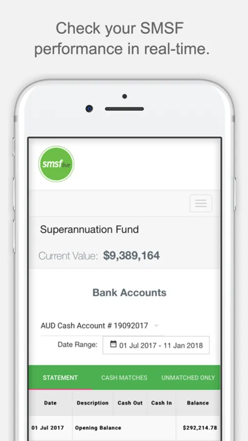 SMSF Live is an administrative platform which enables trustees of SMSFs to login via the website or the App to view their SMSFs financial position and performance in real-time. The SMSF Live app gives you live and secure access to your Self Managed Super Fund (SMSF) investment portfolio, right at your fingertips.