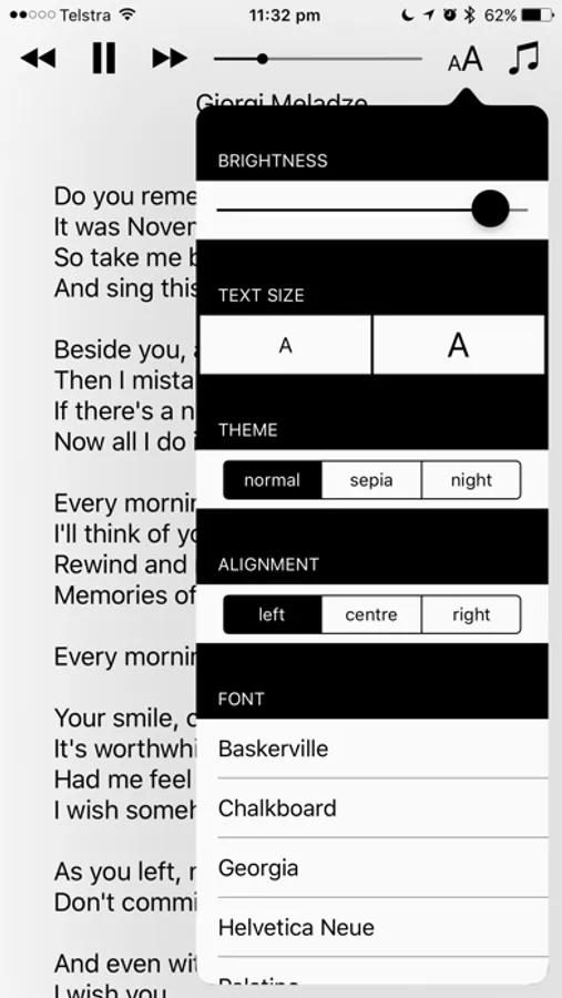 Lyrics View can be used in any orientation on iPhone and fully supports iPad multitasking. With the built-in theme picker, you can change the colour scheme, font, text size and alignment for the best experience.