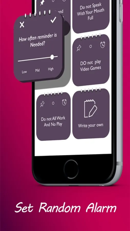 Customize the app to your needs! Write your own custom not to dos or use one of the many samples provided FREE with the app. Sort each not to do into a category to stay organized and on top of your reminders. Change the alarm frequency, time and notification settings to maximize the effectiveness of your not to do lists. There truly is something for everybody!