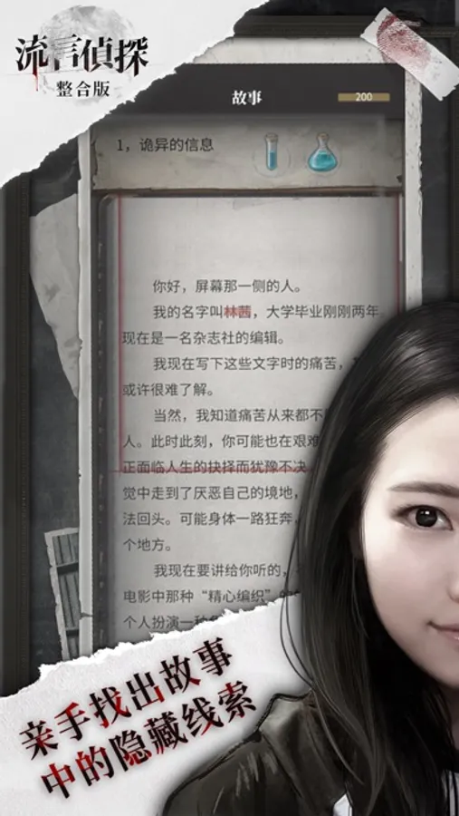 在故事的体验中,玩家需要自主找出线索。并利用线索,和角色对话后推进故事。玩家的选择将影响了解故事的不同侧面。严格的推理玩法,玩家将扮演一个神秘的联络者,通过和诸多角色的聊天推理出事件一层层真相。找出隐藏的凶手。