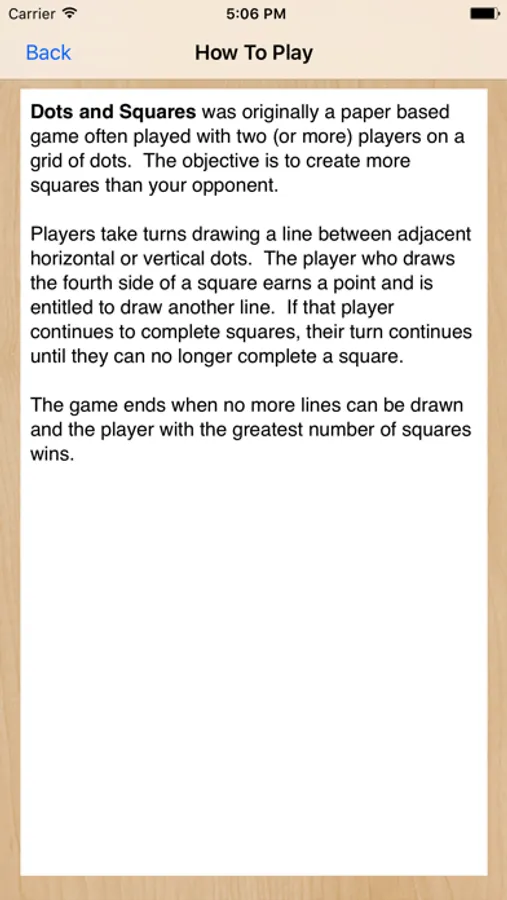 Dots and Squares was originally a paper based game often played with two players on a grid of dots. The objective is to create more squares than your opponent.