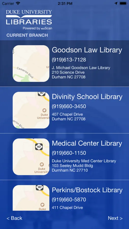 Duke Self-Checkout is a fast, easy way to borrow books from the Duke University Libraries. Currently we are piloting the app with the Marine Lab and Goodson Law Library. We plan to expand it to other libraries soon.