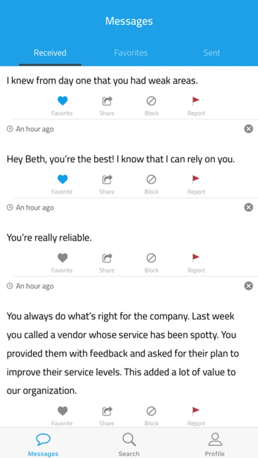 يحاول التطبيق أن يبقى موثوق للحفاظ على الجانب الإيجابي لمستخدميه في الغالب، ولا يكون وسيلة للنقد المباشرة في المعنى عن طريق حث المستخدمين على كتابة “رسالة بناءة”. يمكنك التحكم في من يرسل لك الرسائل عن طريق ضبط الإعدادات، ويمكنك “تفضيل” الرسائل التي ترغب فيها، ولكن لا يمكن الرد على الرسائل.