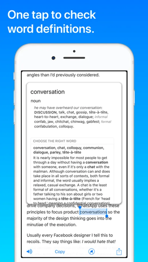 • On article view, you can check word definitions simply by one tap. To close definitions view, it’s also as simple as a tap or swipe