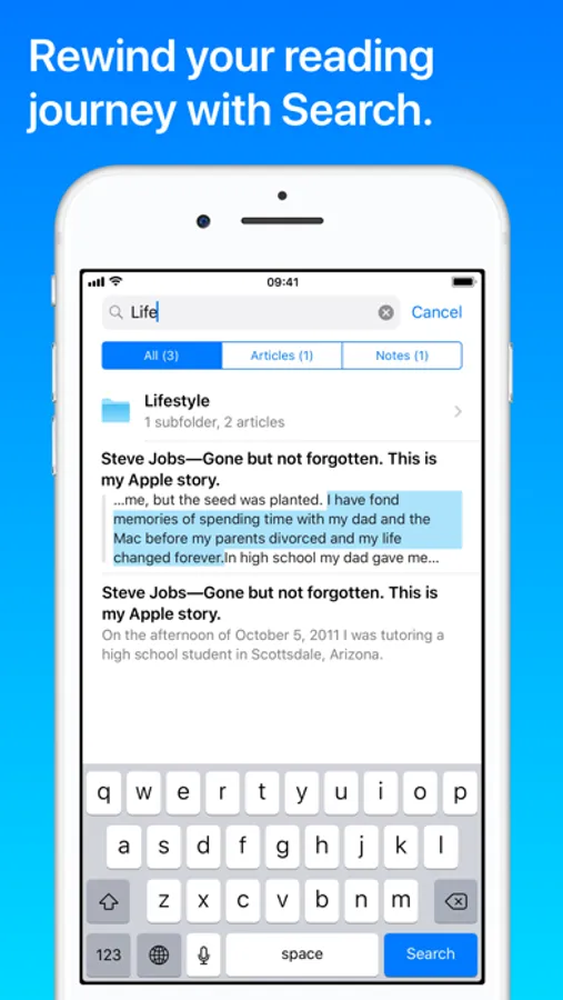 • Search saved articles, notes, folders and more from iOS home screen or in-app search bar