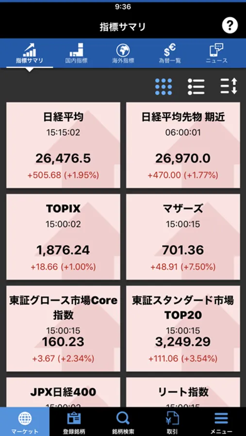 国内指標、海外指標、為替一覧、ニュースなど市況情報をご覧いただけます。タイル表示、一覧表示の切替や表示順の並び替えが可能です。