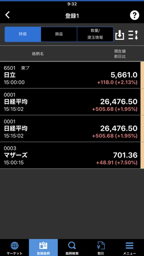 登録した各銘柄を一覧で確認することができます。(最大180銘柄登録可能)