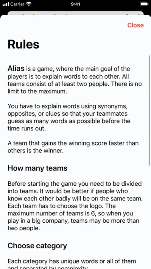 Once you press the "Start" button, the timer will have been turned on, and the first word will have been displayed. Remember, you cannot use any part of the word, nor a derivative of it when explaining. Only members of your team can guess words. If your teammates guessed the word, press "+." Only exact words are accepted. If they can’t guess the word, do not waste your time, press "-," but you will get a penalty (if such a setting is on).