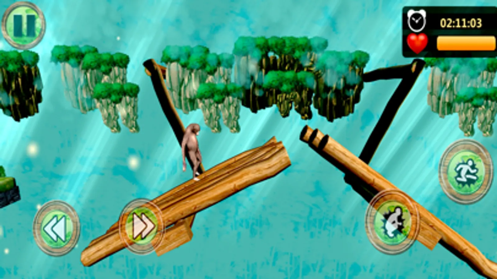 In each world, to reach the final combat, Stunt Monkey will face many obstacles: snails, turtles, birds, bats, spiders, angry gorillas, hedgehogs, fire imps and other small animals. The only defensive weapon Stuntman has against these animals is a stick and peach stones collected during the adventures.