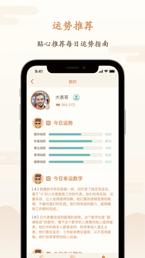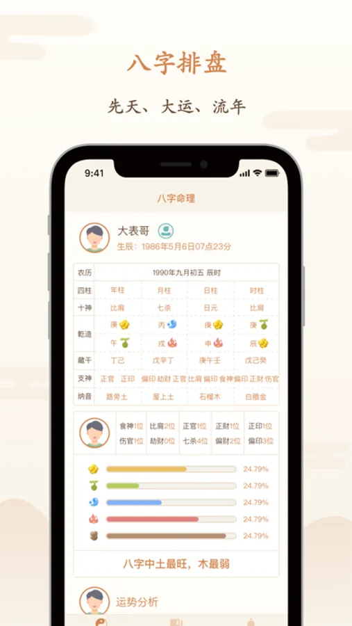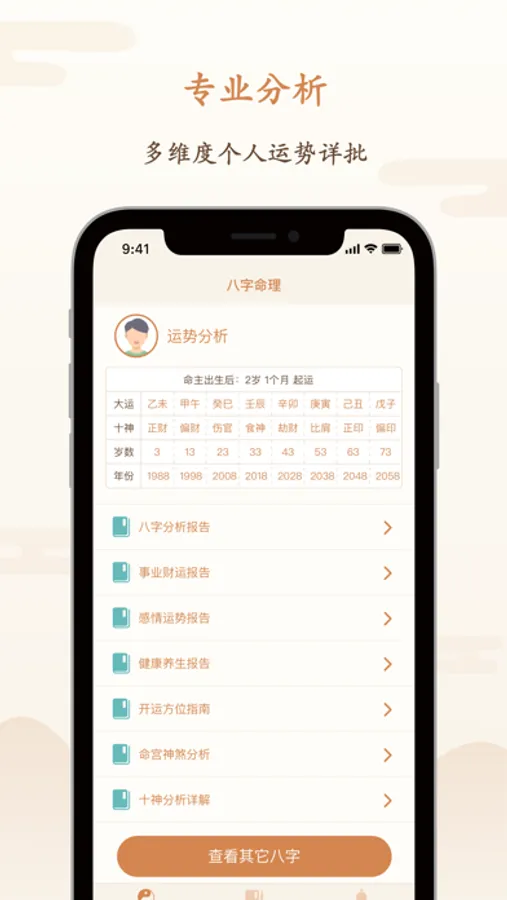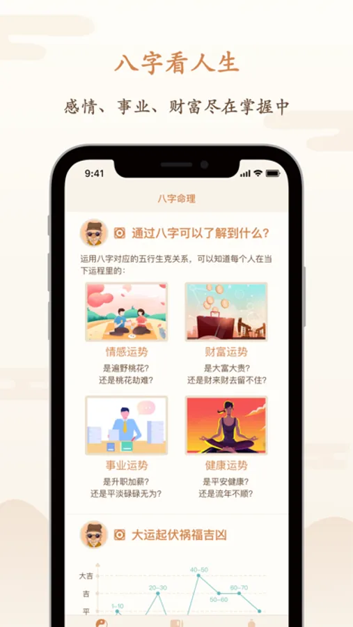 八字算命APP,是一款根据干支历、阴阳五行、神煞等理论推测人的事业、感情、财运、学业、健康、有利方位等事的风水命理应用。时刻关注您的事业财运、感情运势、人生大运、流年运势、健康养生,让您时来运转。