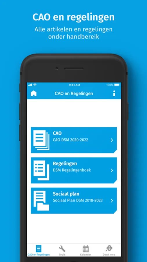 Met de app CAO DSM Nederland heb je je arbeidsvoorwaarden binnen handbereik, kun je deze toepassen op je eigen situatie en kun je meedenken over jouw cao.