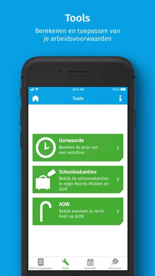 Naast de volledige cao-tekst bevat de app een aantal handige tools zoals een uurwaardecalculator. Ook vind je in de app een kalender met cao-gerelateerde data.
