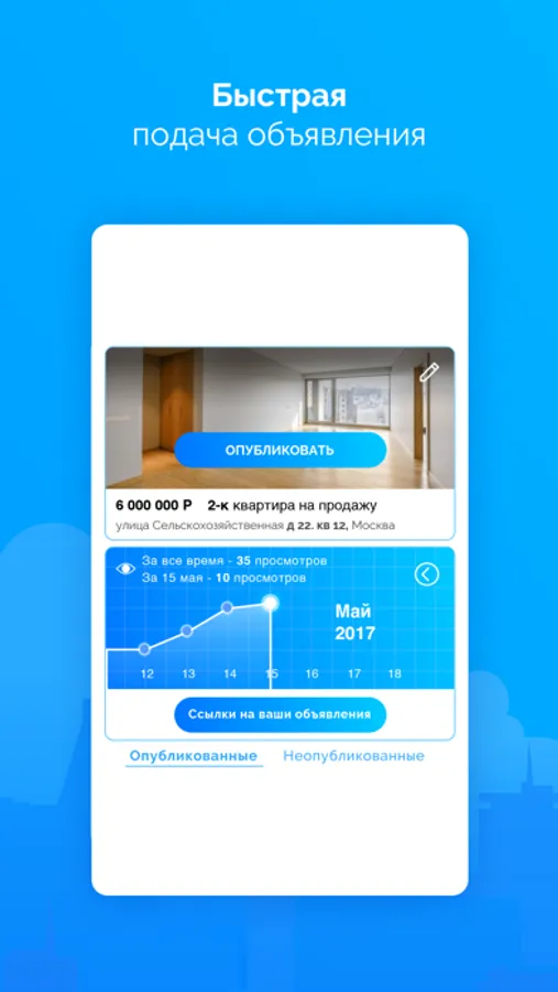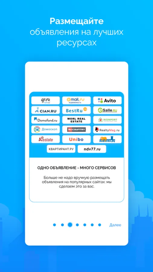 Больше не нужно тратить время на то, чтобы разместить своё объявление на нескольких ресурсах. Заполните форму только один раз, и ваше объявление автоматически опубликуется на топовых ресурсах по продаже недвижимости - cian.ru, avito.ru, domofond.ru, mail.ru Недвижимость и другие.