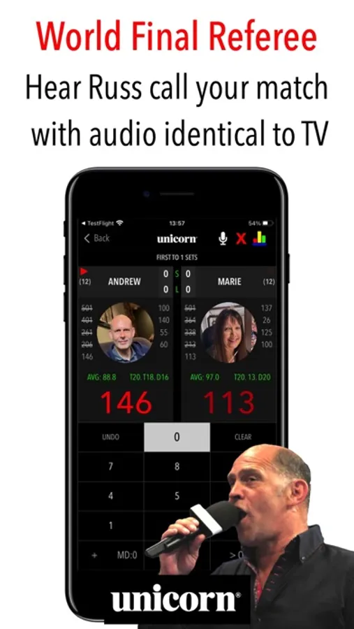 In the app Russ referees your darts match in full including speaking your name, throws, total left, and shot-outs with his silky vocal tones exactly as he does on TV.