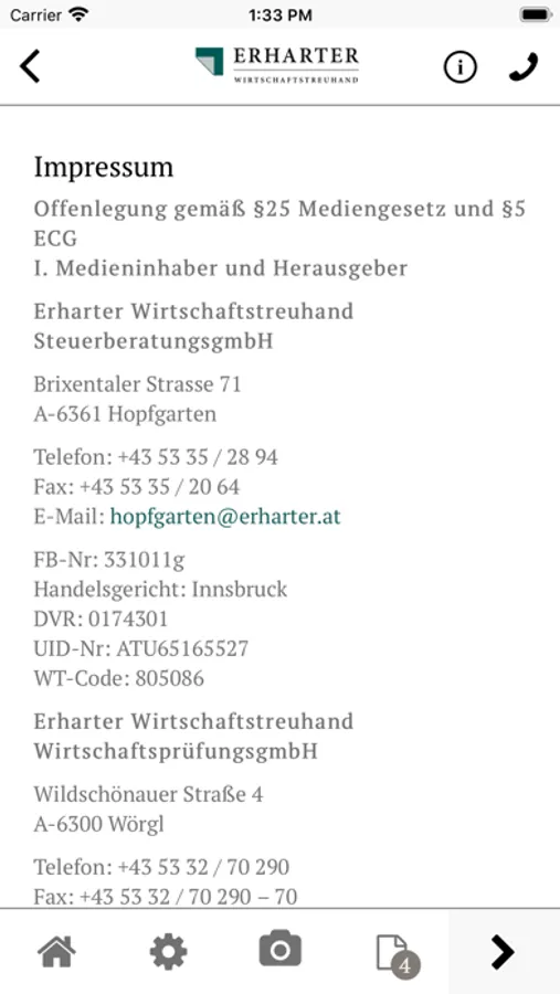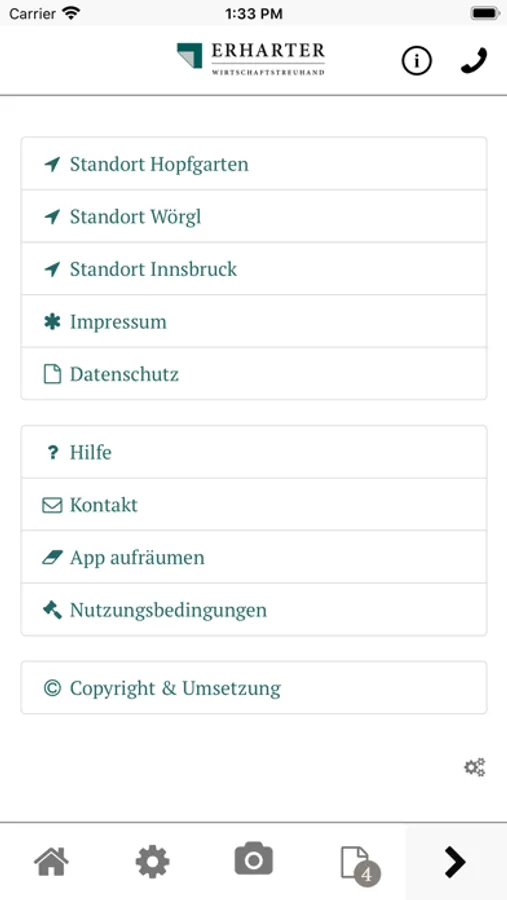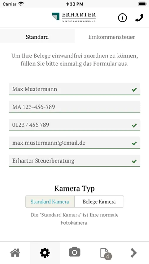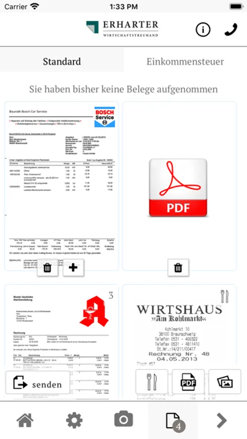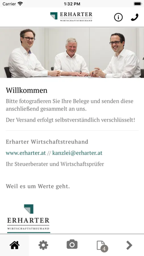 Machen Sie einfach ein oder mehrere Fotos von den Belegen und versenden Sie diese mit einem Klick direkt aus der App heraus an Ihren Ansprechpartner bei der Erharter Wirtschaftstreuhand.