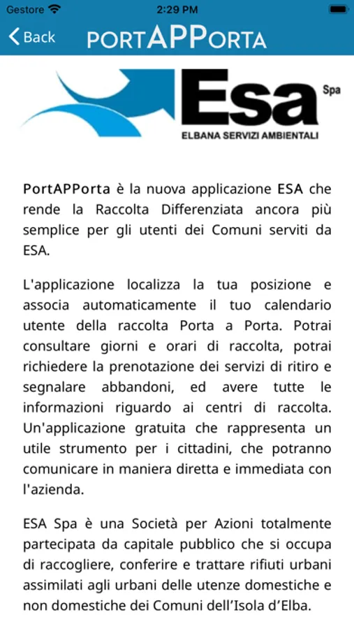 PortAPPorta ESA è la nuova applicazione che rende la Raccolta Differenziata ancora più semplice per gli utenti dei Comuni serviti da ESA. L'applicazione localizza la tua posizione e associa automaticamente il tuo calendario utente della raccolta Porta a Porta. Potrai essere avvertito dei giorni e orari di raccolta, potrai prenotare servizi e segnalare abbandoni, ed avere tutte le informazioni riguardo ai centri di raccolta, impianti e servizi ESA. Un'applicazione gratuita che rappresenta un utile strumento per i cittadini, che potranno comunicare in maniera diretta e immediata con l'azienda.