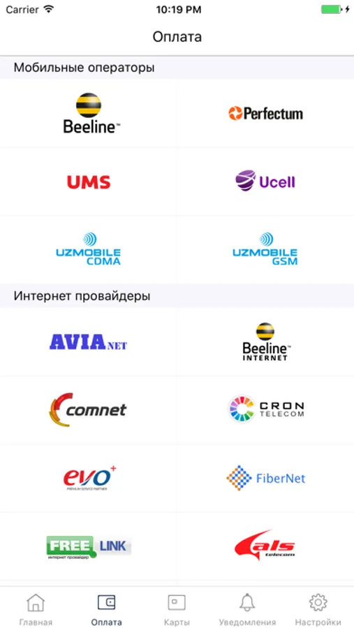 - осуществлять в онлайн режиме оплату товаров и услуг широкого круга поставщиков, список которых постоянно пополняется. Среди наших партнеров все мобильные операторы Республики, интернет провайдеры, поставщики коммунальных услуг, интернет-магазины и многие другие;