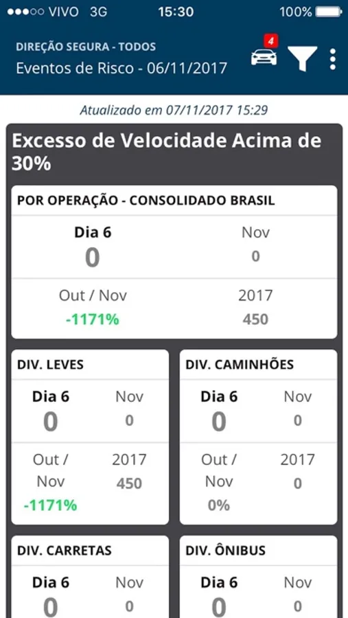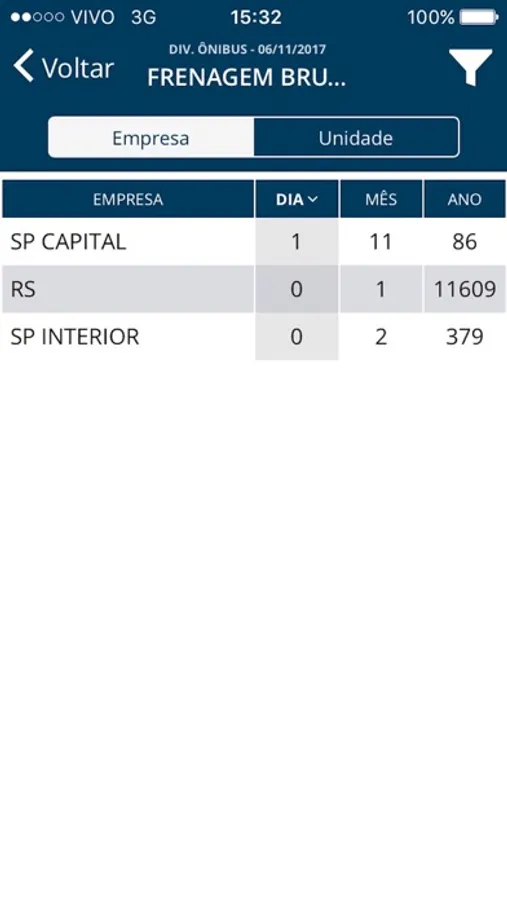Indicadores com detalhamentos por dia, mês e somatório do ano, além de ranking e visualização de dados por unidades de operação e motoristas das empresas.