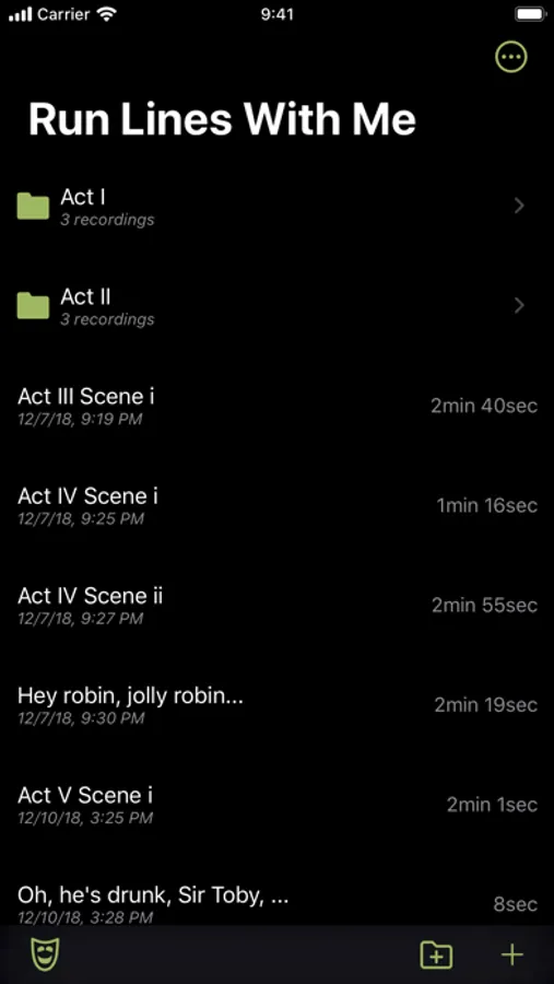 Designed for actors at absolutely all levels, Run Lines With Me gets your lines ready to practice by simply hitting "Record". Don't worry about entering scenes, characters, etc. Just record once through, and you're ready to practice. Have your lines read to you, or leave gaps for you to practice. Work on one section at a time, repeating it until you've got it down. Go through at a normal pace or in a speed-through.