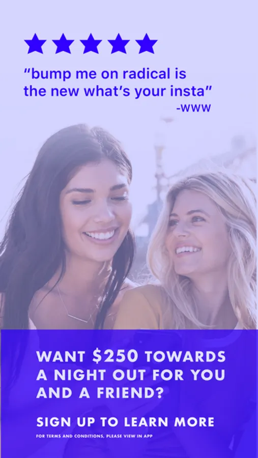 Based on your network of friends, Radical will show you a list of people at the same place as you and how you're connected. You’ll be able to view their profile (photo, first name only, bio), any mutual friends that you share, or other things you might have in common. Send a bump to someone that interests you and if they bump you back, you can start messaging each other.