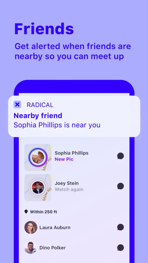 Radical organizes your list of friends by how far away they are from you at any given moment, without sharing their direct location with you. We'll notify you and your friend when you're nearby one another, creating a moment of serendipity to meet up. It's by far one of our most loved features!