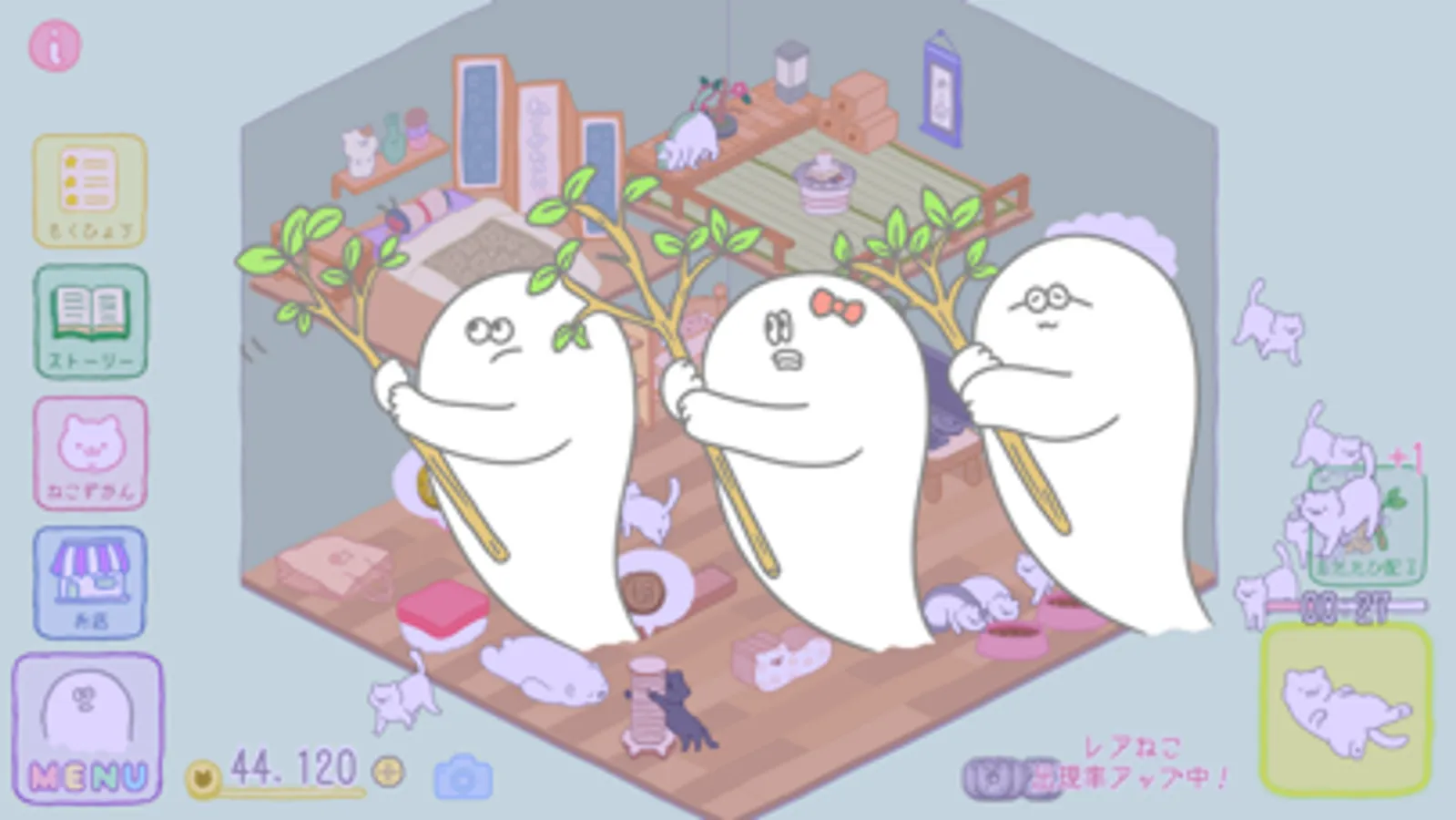 A flash of white light, and whoosh! Turns out you're now a ghost! You don't know how to pass on, so you'll just pass the time instead — with the adorable little cats who visit your house each day!