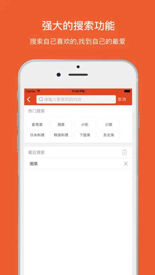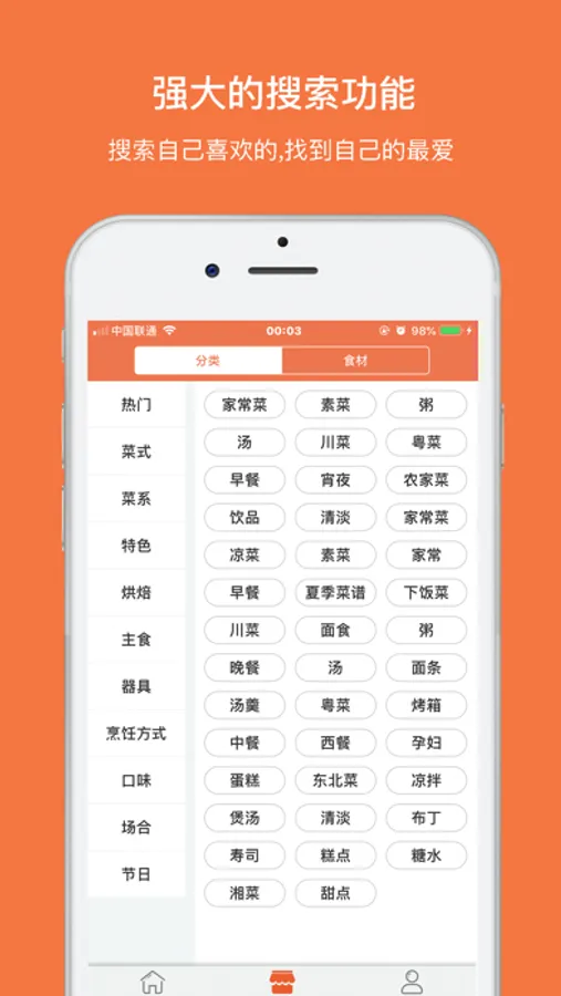 2.强大的搜索,搜索自己喜欢的菜名关键字,精确搜寻定位,找到自己的最爱!