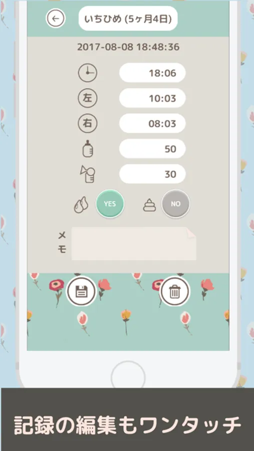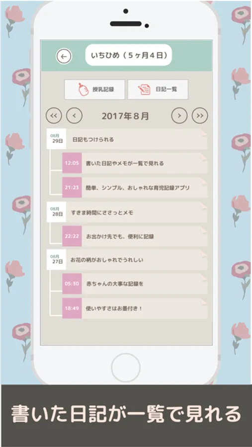 見やすさ、使いやすさを大切にし、ちょっとおしゃれなデザインも嬉しい授乳記録、育児記録のアプリです。日記機能、メモ機能もあるので、いろんなプチ記念日をメモったり、調子が悪い時に体調や様子をメモしたり、使い方はいろいろ。つけた日記は一覧で見れるので、とっても便利です。