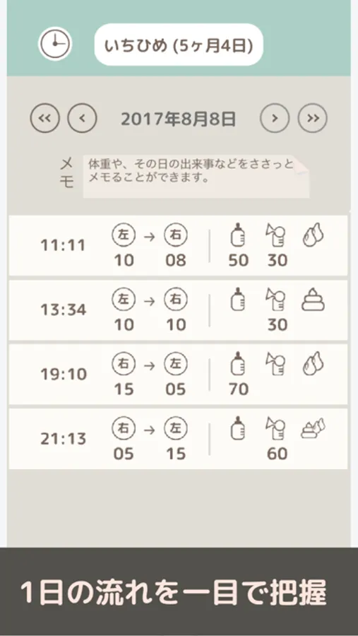 - 授乳開始の時間は自動的に記録されるので、授乳間隔が一目でわかる