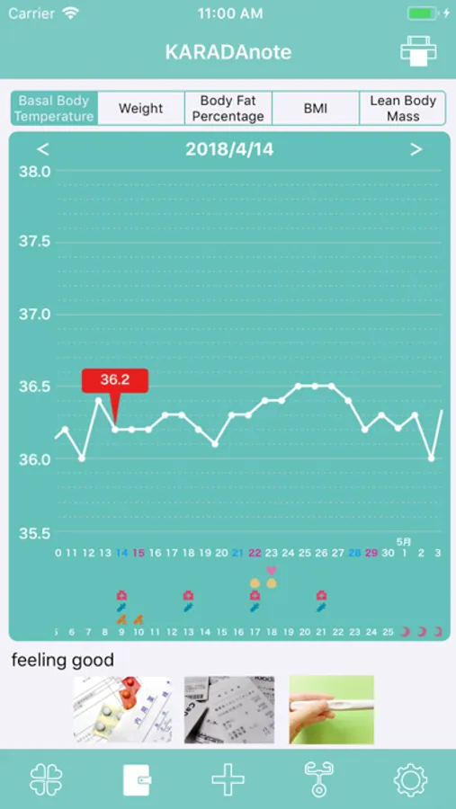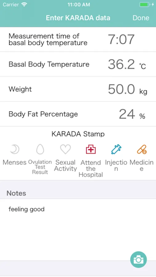 basal body temperature, period, weight, result of ovulation test, sex, visit hospital, injection, take medicine, memo, photo.
