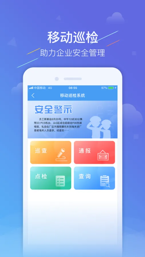 安全移動管理系統主要包含4大模塊:巡檢,通報,點檢及查詢.