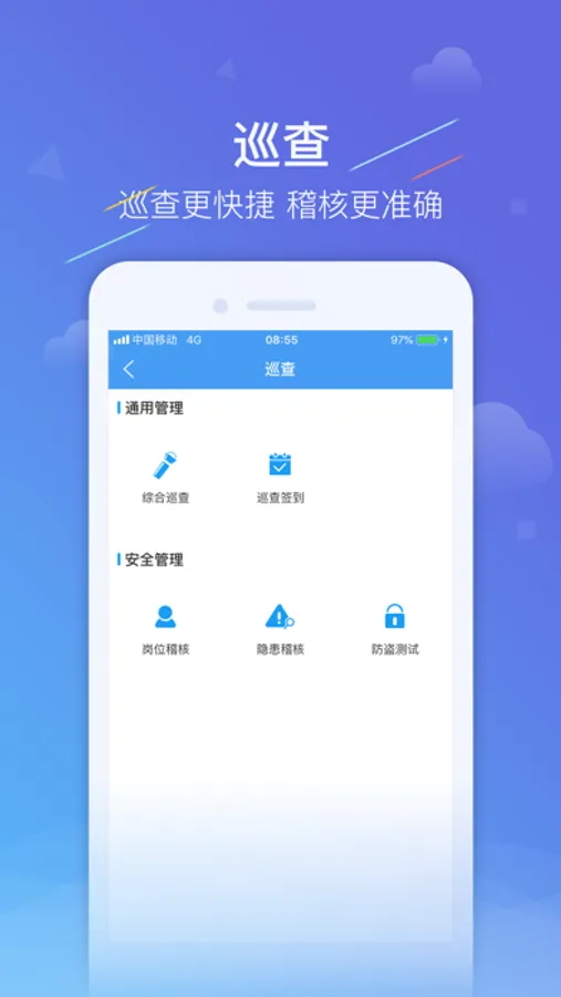 1.巡查模塊包含: 崗位稽核,隱患稽核及防盜測試,安全人員稽核時如發現異常時,可及時用手機APP上傳通報,確保各方可第一時間知曉,并及時處理.