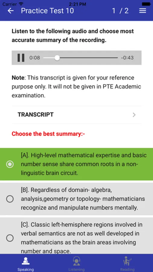 This is an item type that integrates listening and reading skills, and requires test takers to understand, analyze and combine information from a recording, and then identify the most accurate summary of the recording