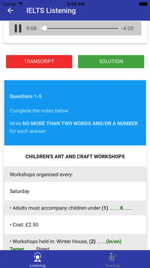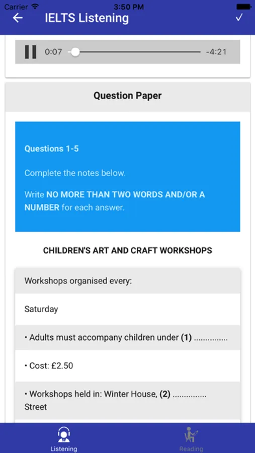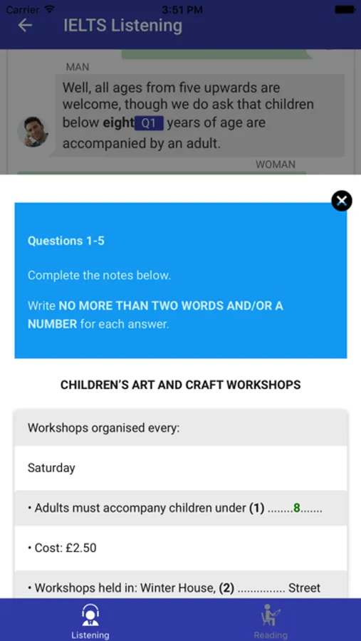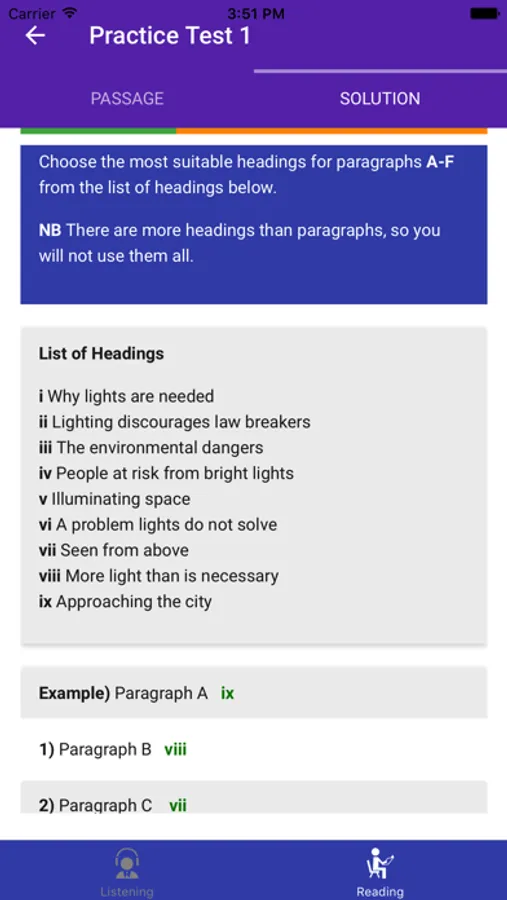 A variety of questions is used, chosen from the following types: multiple choice, identifying information, identifying writer’s views/claims, matching information, matching headings, matching features, matching sentence endings, sentence completion, summary completion, note completion, table completion, flow-chart completion, diagram label completion, short-answer questions.